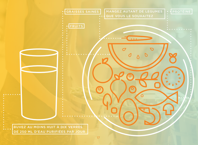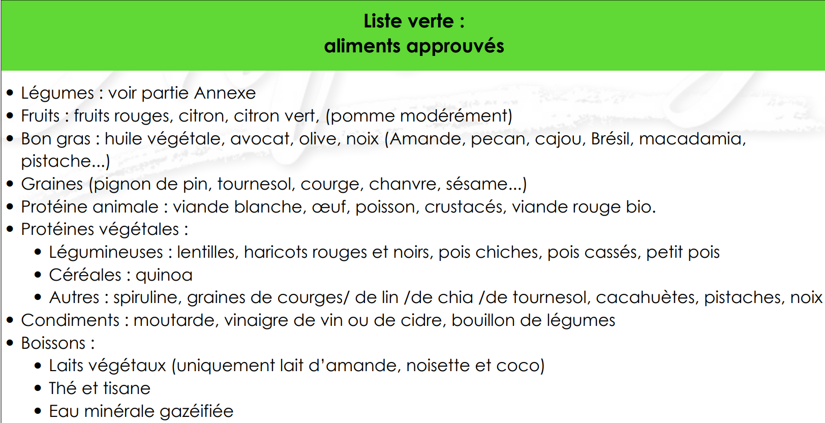 • Légumes : voir partie Annexe • Fruits : fruits rouges, citron, citron vert, (pomme modérément) • Bon gras : huile végétale, avocat, olive, noix (Amande, pecan, cajou, Brésil, macadamia, pistache...) • Graines (pignon de pin, tournesol, courge, chanvre, sésame...) • Protéine animale : viande blanche, œuf, poisson, crustacés, viande rouge bio. • Protéines végétales : • Légumineuses : lentilles, haricots rouges et noirs, pois chiches, pois cassés, petit pois • Céréales : quinoa • Autres : spiruline, graines de courges/ de lin /de chia /de tournesol, cacahuètes, pistaches, noix • Condiments : moutarde, vinaigre de vin ou de cidre, bouillon de légumes • Boissons : • Laits végétaux (uniquement lait d'amande, noisette et coco) • Thé et tisane • Eau minérale gazéifiée